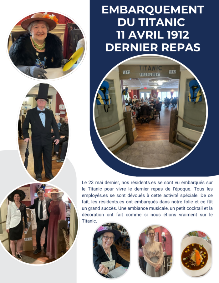 Le 23 mai dernier, nos résidents.es se sont vu embarqués sur le Titanic pour vivre le dernier repas de l’époque. Tous les employés.es se sont dévoués à cette activité sp
